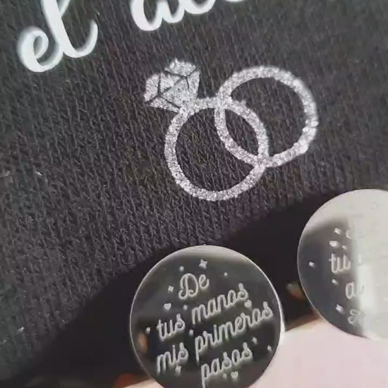 Y para completar este regalo único, unos divertidos calcetines con la frase "Sí, quiero ir contigo hasta el altar", que seguro le sacarán una sonrisa.